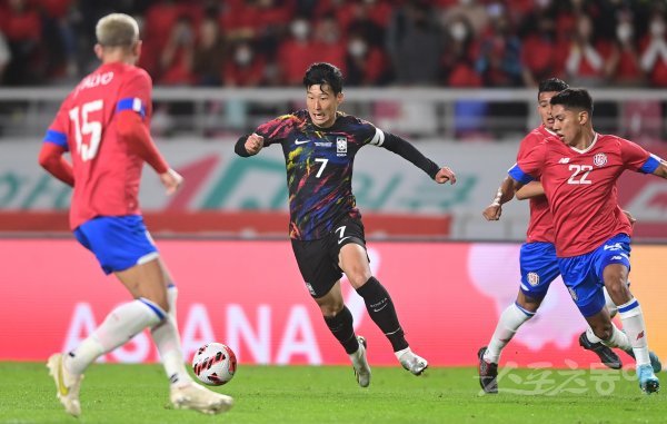 23일 경기도 고양종합운동장에서 열린 ‘하나은행 초청 축구국가대표팀 친선경기’ 한국과 코스타리카의 경기에서 한국 손흥민이 드리블 돌파를 하고 있다.