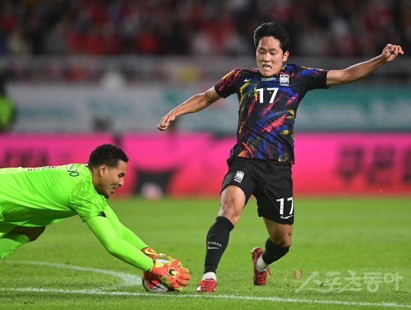 23일 경기도 고양종합운동장에서 열린 ‘하나은행 초청 축구국가대표팀 친선경기’ 한국과 코스타리카의 경기에서 한국 나상호에 앞에서 코스타리카 알바라도가 라인 아웃 반칙을 범하고 있다.