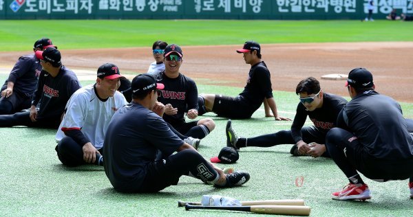 25일 인천 SSG 랜더스필드에서 ‘2022 신한은행 SOL KBO리그’ SSG 랜더스와 LG 트윈스의 경기가 열린다. 경기 전 LG 선수들이 스트레칭 훈련을 펼치고 있다.