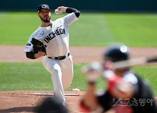 25일 인천 SSG 랜더스필드에서 ‘2022 신한은행 SOL KBO리그’ SSG 랜더스와 LG 트윈스의 경기가 열렸다. SSG 선발투수 모리만도가 힘차게 볼을 던지고 있다.