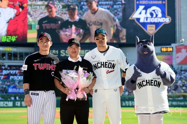 25일 인천 SSG 랜더스필드에서 ‘2022 신한은행 SOL KBO리그’ SSG 랜더스와 LG 트윈스의 경기가 열렸다. 클리닝 타임 때 KBO 레전드 40인에 선정된 정근우가 LG 오지환, SSG 한유섬과 기념촬영을 하고 있다.