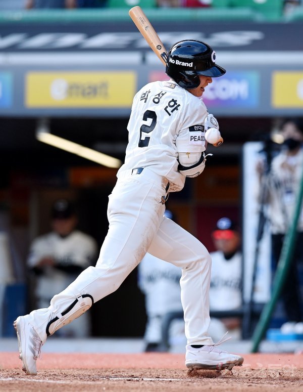 25일 인천 SSG 랜더스필드에서 ‘2022 신한은행 SOL KBO리그’ SSG 랜더스와 LG 트윈스의 경기가 열렸다. 5회말 1사에서 SSG 박성한이 투구에 맞고 있다.