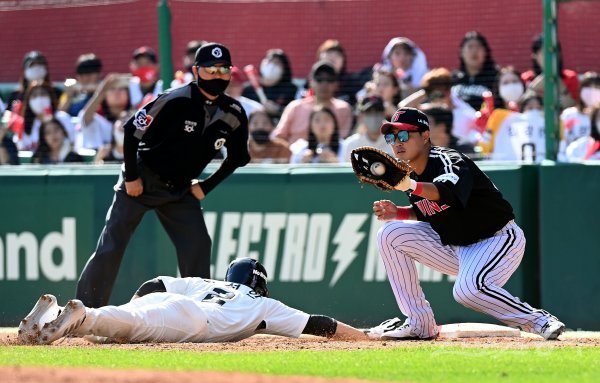 25일 인천 SSG 랜더스필드에서 ‘2022 신한은행 SOL KBO리그’ SSG 랜더스와 LG 트윈스의 경기가 열렸다. 5회말 1사 1루에서 SSG 박성한이 견제에 1루로 귀루하고 있다.
