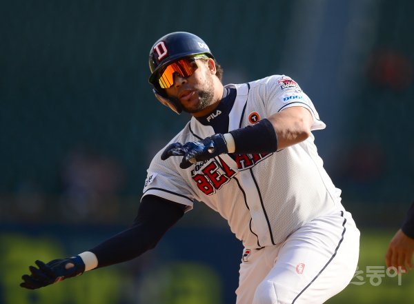 25일 서울 잠실야구장에서 ‘2022 신한은행 MY CAR KBO리그’ 한화 이글스와 두사 베어스 경기가 열렸다. 6회말 무사 3루 두산 페르난데스가 1타점 적시타를 치고 1루에서 기뻐하고 있다.