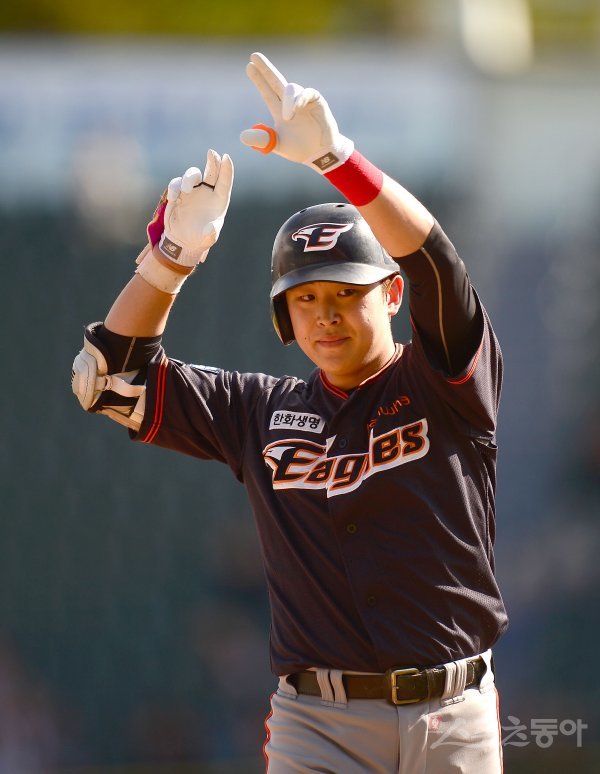25일 서울 잠실야구장에서 ‘2022 신한은행 MY CAR KBO리그’ 한화 이글스와 두사 베어스 경기가 열렸다. 5회초 1사 2,3루 한화 정은원이 동점을 만드는 2타점 중전 안타를 1루에서 기뻐하고 있다.