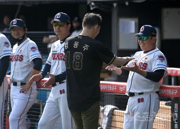 25일 서울 잠실야구장에서 ‘2022 신한은행 MY CAR KBO리그’ 한화 이글스와 두사 베어스 경기가 열렸다. KBO 레전드 40인에 선정된 김동주가 클리닝타임 때 시상식을 마치고 두산 김태형 감독과 인사하고 있다.