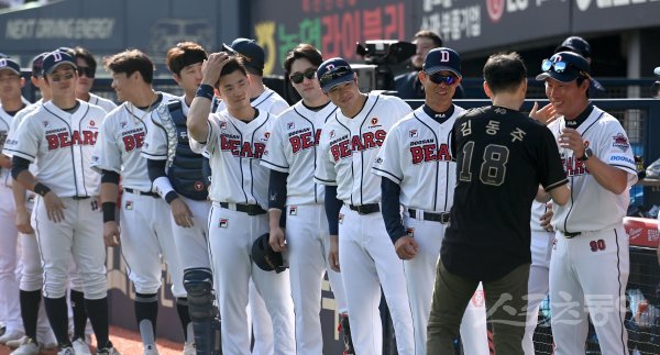 25일 서울 잠실야구장에서 ‘2022 신한은행 MY CAR KBO리그’ 한화 이글스와 두사 베어스 경기가 열렸다. KBO 레전드 40인에 선정된 김동주가 클리닝타임 때 시상식을 마치고 두산 코치, 선수들과 인사하고 있다.