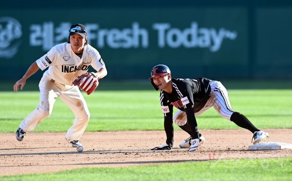 25일 인천 SSG 랜더스필드에서 ‘2022 신한은행 SOL KBO리그’ SSG 랜더스와 LG 트윈스의 경기가 열렸다. 9회초 2사 1, 2루에서 LG 신민재가 폭투로 2루까지 진루하고 있다.