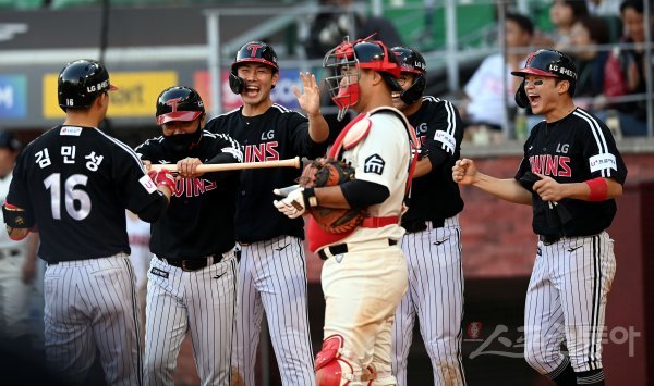 25일 인천 SSG 랜더스필드에서 ‘2022 신한은행 SOL KBO리그’ SSG 랜더스와 LG 트윈스의 경기가 열렸다. 연장 10회초 2사 만루에서 LG 김민성이 역전 만루 홈런을 쏘아 올린 후 동료들의 환영을 받고 있다.