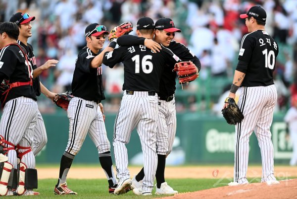 25일 인천 SSG 랜더스필드에서 ‘2022 신한은행 SOL KBO리그’ SSG 랜더스와 LG 트윈스의 경기가 열렸다. LG가 연장 끝에 SSG를 상대로 6-2로 승리한 후 선수들이 그라운드에서 기쁨을 나누고 있다.