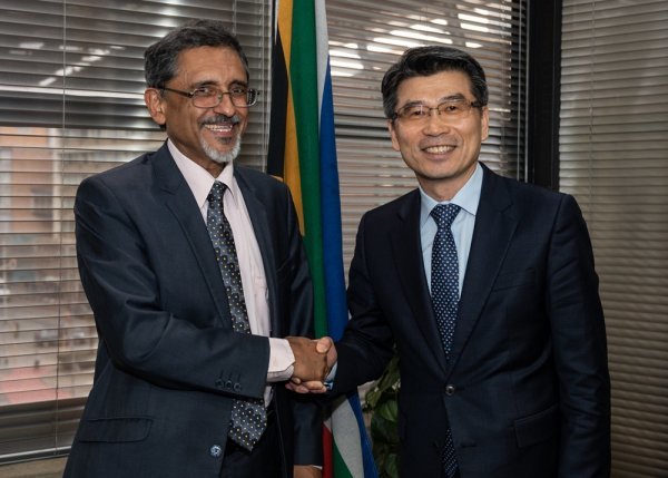 19일 남아프리카공화국 행정수도 프리토리아에 위치한 산업통상부 청사에서 기아 송호성 사장(오른쪽)이 에브라힘 파텔 남아공 산업통상부 장관과 기념 촬영을 하고 있다. 사진제공|현대차
