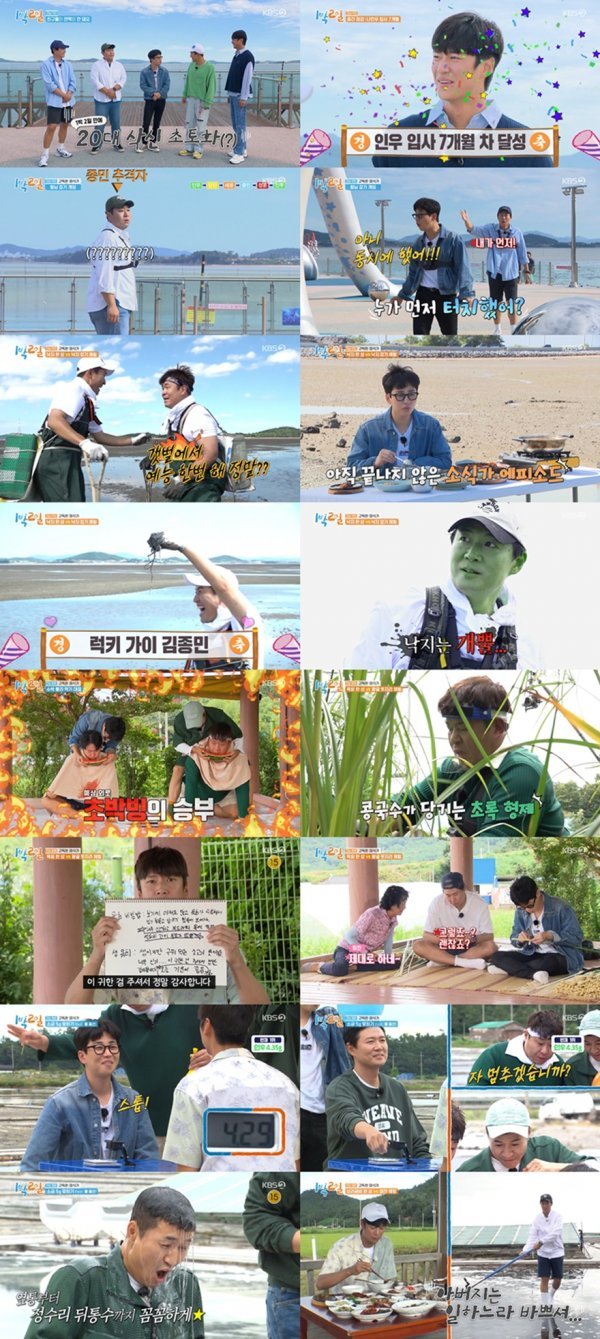 남겨진 이들은 업무 분담을 위해 ‘2인 1조 수박 빨리 먹기’ 팀전 대결에 나섰고, 연정훈은 문세윤을 상대로 예상외의 초박빙 접전을 벌이며 모두의 시선을 고정시켰다. 또한, 문세윤은 자신의 얼굴에 수박을 인정사정없이 들이미는 팀원 김종민 때문에 수박 세수 세례를 당하고 억울하게 패배하기도. 승리한 연정훈, 딘딘은 정자에서 왕초 박피 작업에 돌입한 가운데, 문세윤, 김종민은 무려 200평의 왕초 밭으로 향해 진땀을 흘리며 수확을 시작했다. 쉴 틈 없는 노동으로 바쁜 시간을 보낸 이들은 육회 없는 육회 비빔밥 먹방으로 단꿈 같은 힐링을 만끽했다.