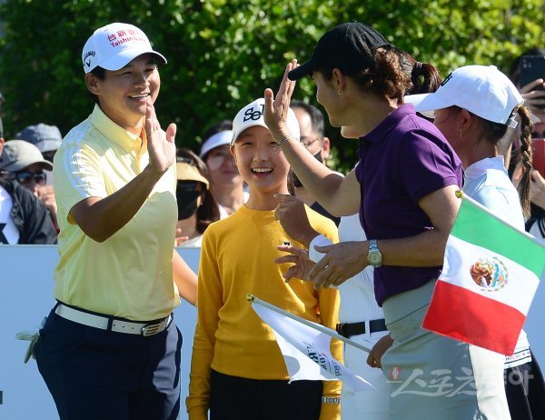 26일 인천 베어즈베스트 청라CC에서 열린 ‘LG전자 박세리 월드매치’ 10번 홀에서 청야니와 로레나 오초아가 하이파이브를 하고 있다.