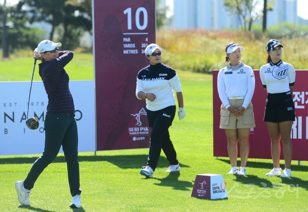 26일 인천 베어즈베스트 청라CC에서 열린 ‘LG전자 박세리 월드매치’ 10번 홀에서 아니카 소렌스탐이 티샷을 하고 있다.