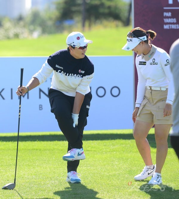 26일 인천 베어즈베스트 청라CC에서 열린 ‘LG전자 박세리 월드매치’ 10번 홀에서 박세리가 티샷을 한 후 종아리를 잡고 있다.
