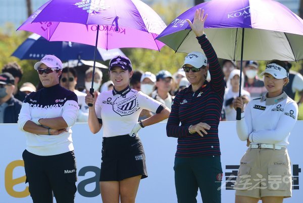 26일 인천 베어즈베스트 청라CC에서 열린 ‘LG전자 박세리 월드매치’ 10번 홀에서 박세리, 박현경, 아니카 소렌스탐, 임희정이 팬들에게 인사하고 있다.