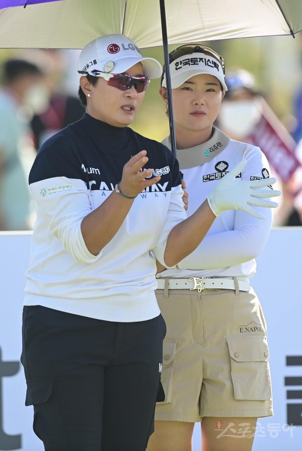 26일 인천 베어즈베스트 청라CC에서 열린 ‘LG전자 박세리 월드매치’ 10번 홀에서 박세리와 임희정이 이야기를 하고 있다.