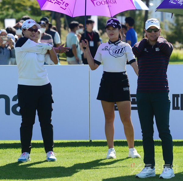 26일 인천 베어즈베스트 청라CC에서 열린 ‘LG전자 박세리 월드매치’ 10번 홀에서 박세리와 아니카 소렌스탐이 티샷을 준비하고 있다.