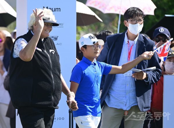 26일 인천 베어즈베스트 청라CC에서 열린 ‘LG전자 박세리 월드매치’ 10번 홀에서 로라 데이비스가 박세리키드와 입장하고 있다.