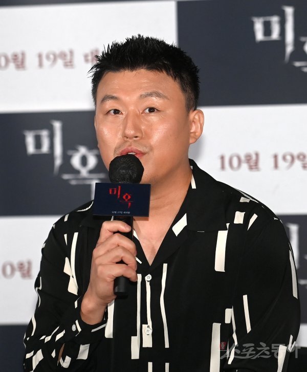 26일 서울 강남구 메가박스 코엑스점에서 열린 영화 ‘미혹’ 시사회에서 배우 김민재가 취재진의 질문에 대답하고 있다.