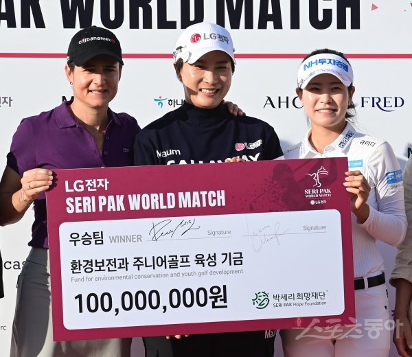 26일 인천 베어즈베스트 청라CC에서 열린 ‘LG전자 박세리 월드매치’ 기부금 전달식에서 우승을 차지한 로레나 오초아, 박민지가 박세리와 기념 촬영을 하고 있다.