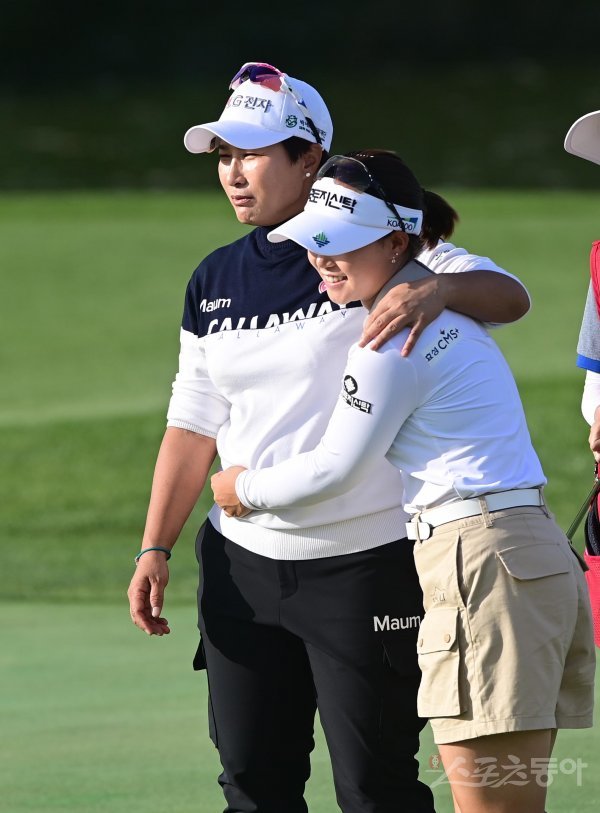 26일 인천 베어즈베스트 청라CC에서 열린 ‘LG전자 박세리 월드매치’ 18번 홀에서 경기를 마친 박세리와 임희정이 포옹하고 있다.