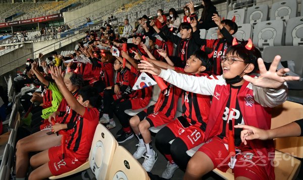 26일 경기도 화성종합경기타운에서 한국과 우즈베키스탄의 올림픽축구대표팀 평가전 경기가 열렸다. 실외마스크 착용의무가 전면 해제되어 어린이축구팬들이 마스크를 벗고 응원을 펼치고 있다.