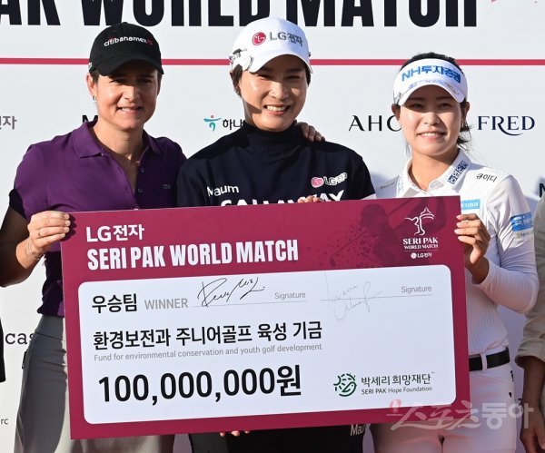취하고 있다. 2언더파를 합작한 오초아-박민지는 자신들의 이름으로 환경보전과 주니어골프 육성기금 1억 원을 전달하는 기쁨을
