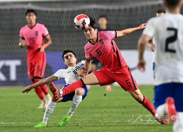 26일 경기도 화성종합경기타운에서 한국과 우즈베키스탄의 올림픽축구대표팀 평가전 경기가 열렸다. 한국 이진용이 우즈베키스탄 선수와 볼 다툼을 벌이고 있다.