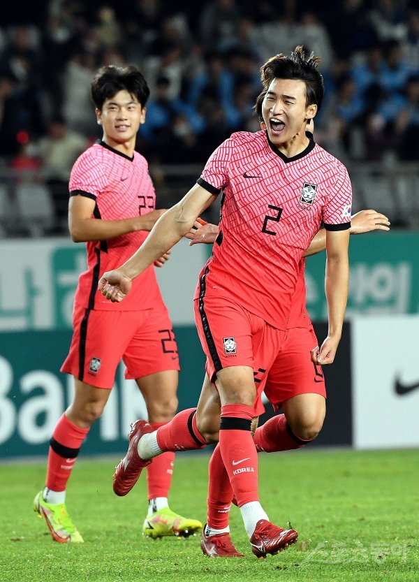 26일 경기도 화성종합경기타운에서 한국과 우즈베키스탄의 올림픽축구대표팀 평가전 경기가 열렸다. 한국 조현택이 프리킥 동점 골을 넣은 후 환호하고 있다.