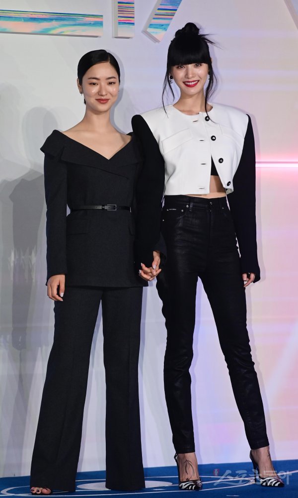 배우 전여빈과 나나가 27일 서울 용산구 CGV용산아이파크몰점에서 열린 넷플릭스 ‘글리치’ 제작발표회에서 포즈를 취하고 있다.