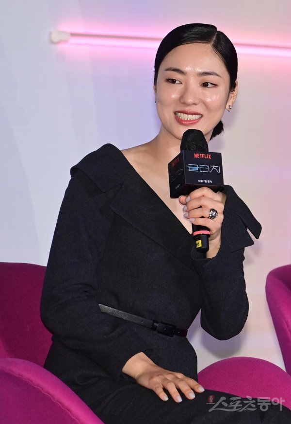 배우 전여빈이 27일 서울 용산구 CGV용산아이파크몰점에서 열린 넷플릭스 ‘글리치’ 제작발표회에서 진행자의 질문에 답하고 있다. 주현희 기자 teth1147@donga.com