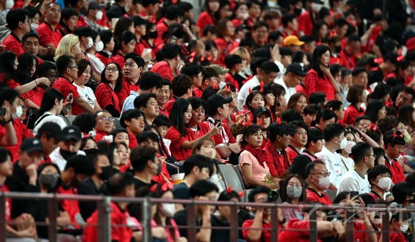 27일 서울 상암동 서울월드컵경기장에서 한국과 카메룬의 축구대표팀 평가전 경기가 열렸다. 실외마스크 착용의무 해제 후 축구팬들이 마스크를 벗은 채 응원을 펼치고 있다.