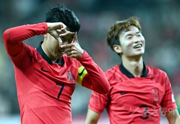 27일 서울 상암동 서울월드컵경기장에서 한국과 카메룬의 축구대표팀 평가전 경기가 열렸다. 한국 손흥민이 골을 넣은 후 세리머니를 펼치고 있다.