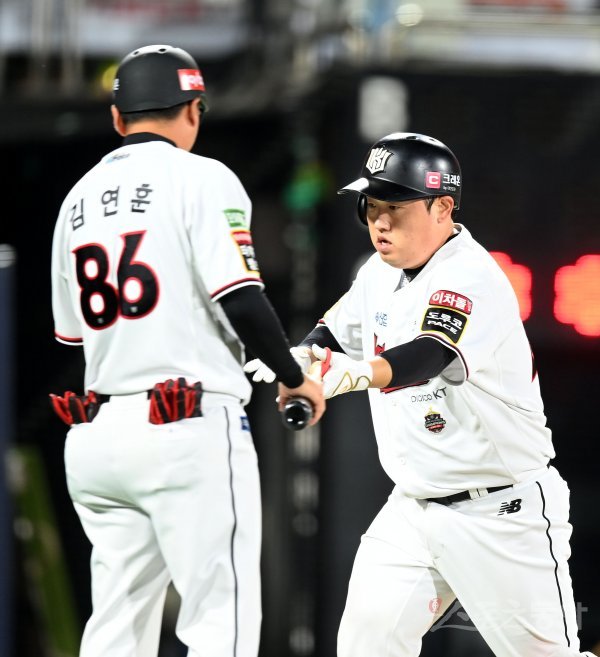 27일 수원KT위즈파크에서 ‘2022 신한은행 MY CAR KBO리그’ 두산 베어스와 KT 위즈 경기가 열렸다. 7회말 2사 KT 김준태가 동점 우월 솔로 홈런을 날리고 그라운드를 돌아 홈인학 있다.