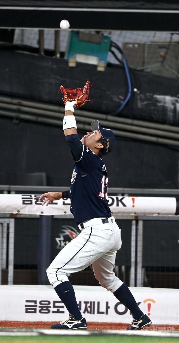 27일 수원KT위즈파크에서 ‘2022 신한은행 MY CAR KBO리그’ 두산 베어스와 KT 위즈 경기가 열렸다. 7회말 1사 두산 허경민이 파울볼을 잡고 있다.