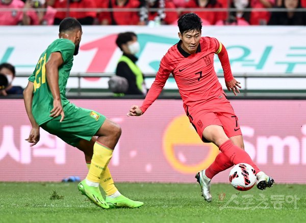 27일 서울 상암동 서울월드컵경기장에서 한국과 카메룬의 축구대표팀 평가전 경기가 열렸다. 한국 손흥민이 카메룬 선수의 수비를 제치며 돌파를 시도하고 있다.