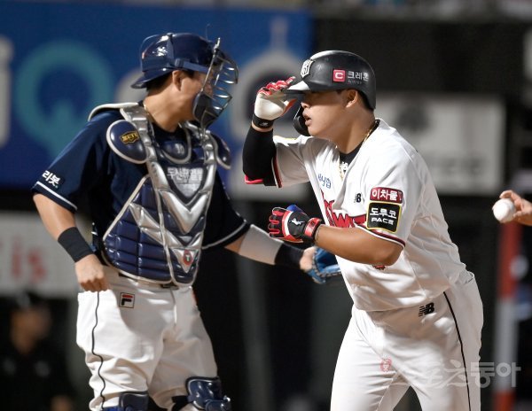 27일 수원KT위즈파크에서 ‘2022 신한은행 MY CAR KBO리그’ 두산 베어스와 KT 위즈 경기가 열렸다. 8회말 1사 1,2루 KT 강백호가 동점을 만드는 좌중월 스리런 홈런을 날리고 그라운드를 돌아 홈인해 하이파이브 하고 있다.