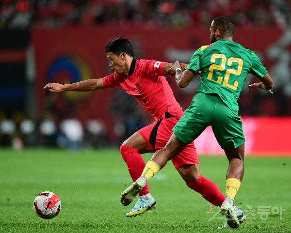 27일 서울월드컵경기장에서 열린 ‘하나은행 초청 축구국가대표팀 친선경기’ 한국과 카메룬의 경기에서 한국 황희찬이 카메룬 수비를 뚫고 드리블 돌파하고 있다.