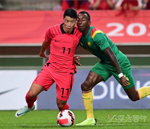 27일 서울월드컵경기장에서 열린 ‘하나은행 초청 축구국가대표팀 친선경기’ 한국과 카메룬의 경기에서 한국 황희찬이 카메룬 수비를 뚫고 드리블 돌파하고 있다.