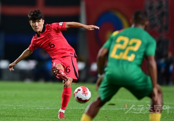 27일 서울월드컵경기장에서 열린 ‘하나은행 초청 축구국가대표팀 친선경기’ 한국과 카메룬의 경기에서 한국 황인범이 카메룬 수비 앞에서 패스하고 있다.