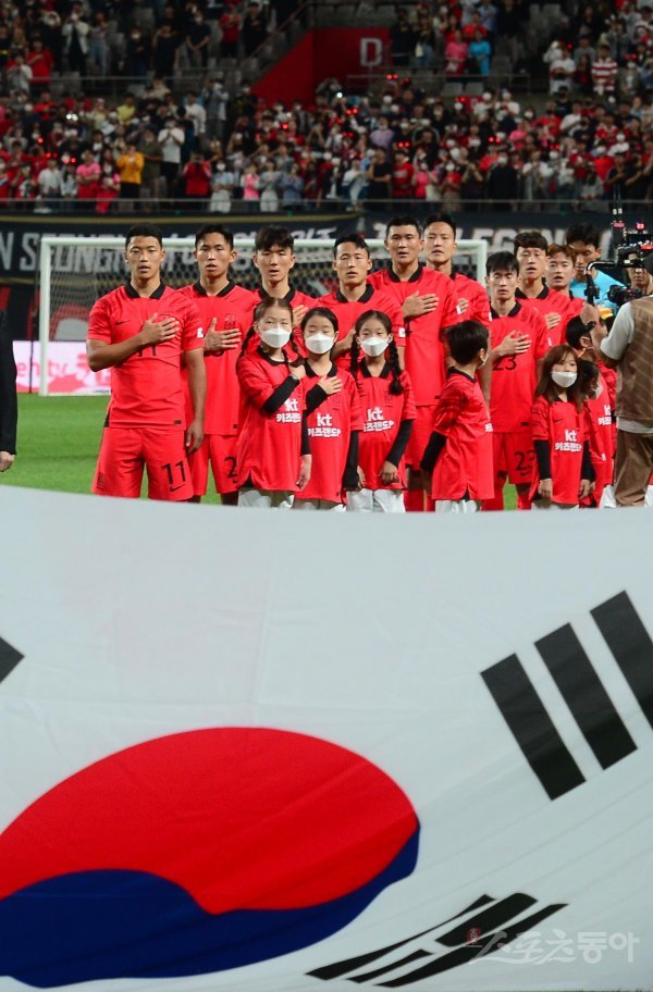 27일 서울월드컵경기장에서 열린 ‘하나은행 초청 축구국가대표팀 친선경기’ 한국과 카메룬의 경기에서 한국 선수들이 애국가 제창을 하고 있다.