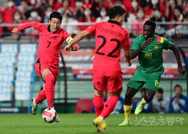 27일 서울월드컵경기장에서 열린 ‘하나은행 초청 축구국가대표팀 친선경기’ 한국과 카메룬의 경기에서 한국 손흥민이 카메룬 수비를 뚫고 드리블 돌파하고 있다.