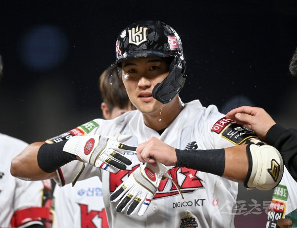 27일 수원KT위즈파크에서 ‘2022 신한은행 MY CAR KBO리그’ 두산 베어스와 KT 위즈 경기가 열렸다. 9회말 1사 2,3루 KT 배정대가 끝내기 안타를 치고 동료들과 기뻐하고 있다.