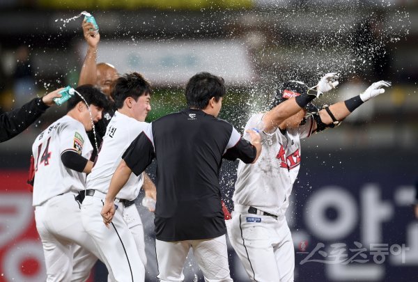 27일 수원KT위즈파크에서 ‘2022 신한은행 MY CAR KBO리그’ 두산 베어스와 KT 위즈 경기가 열렸다. 9회말 1사 2,3루 KT 배정대가 끝내기 안타를 치고 동료들과 기뻐하고 있다.