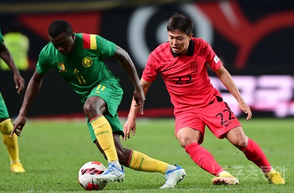 27일 서울월드컵경기장에서 열린 ‘하나은행 초청 축구국가대표팀 친선경기’ 한국과 카메룬의 경기에서 한국 권창훈이 카메룬 공격수를 수비하고 있다.