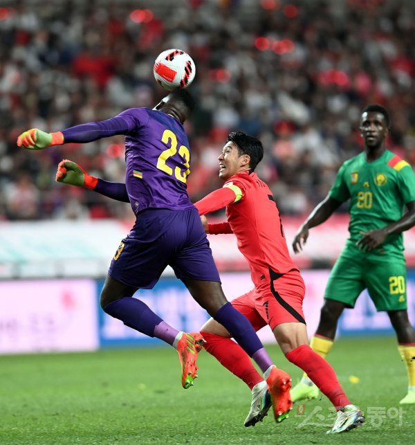 27일 서울 상암동 서울월드컵경기장에서 한국과 카메룬의 축구대표팀 평가전 경기가 열렸다. 한국 손흥민이 카메룬 골키퍼의 수비에 막히고 있다.