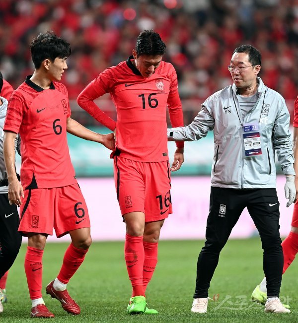 27일 서울 상암동 서울월드컵경기장에서 한국과 카메룬의 축구대표팀 평가전 경기가 열렸다. 한국 황의조가 부상으로 교체되고 있다.