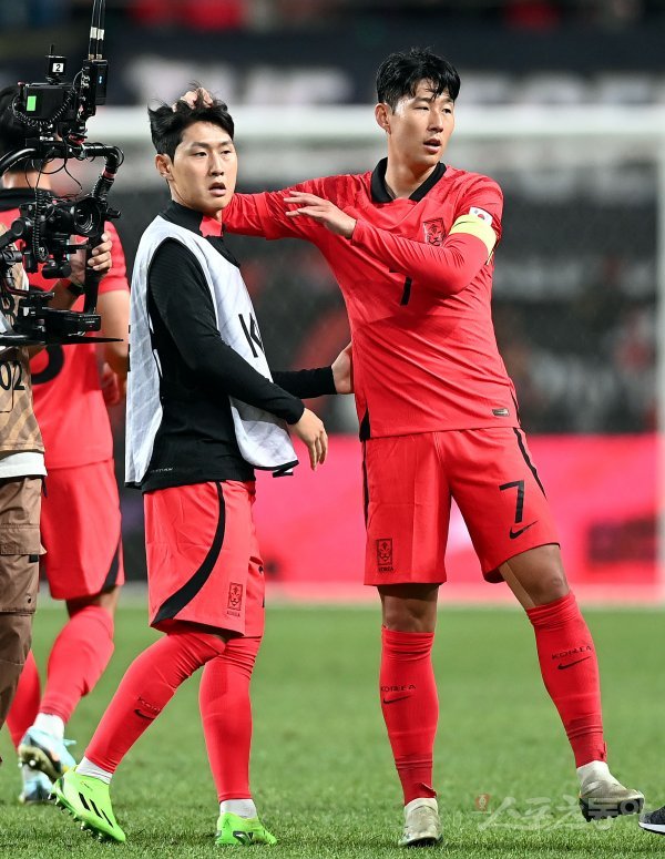 27일 서울 상암동 서울월드컵경기장에서 한국과 카메룬의 축구대표팀 평가전 경기가 열렸다. 한국이 카메룬을 상대로 1-0으로 승리한 뒤 손흥민이 벤치에 앉아있던 이강인을 위로하고 있다.