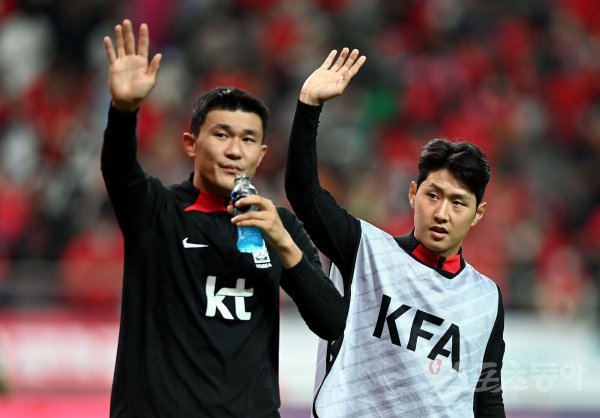 27일 서울 상암동 서울월드컵경기장에서 한국과 카메룬의 축구대표팀 평가전 경기가 열렸다. 한국이 카메룬을 상대로 1-0으로 승리한 뒤 이강인이 김민재와 함께 팬들에게 손을 흔들고 있다.